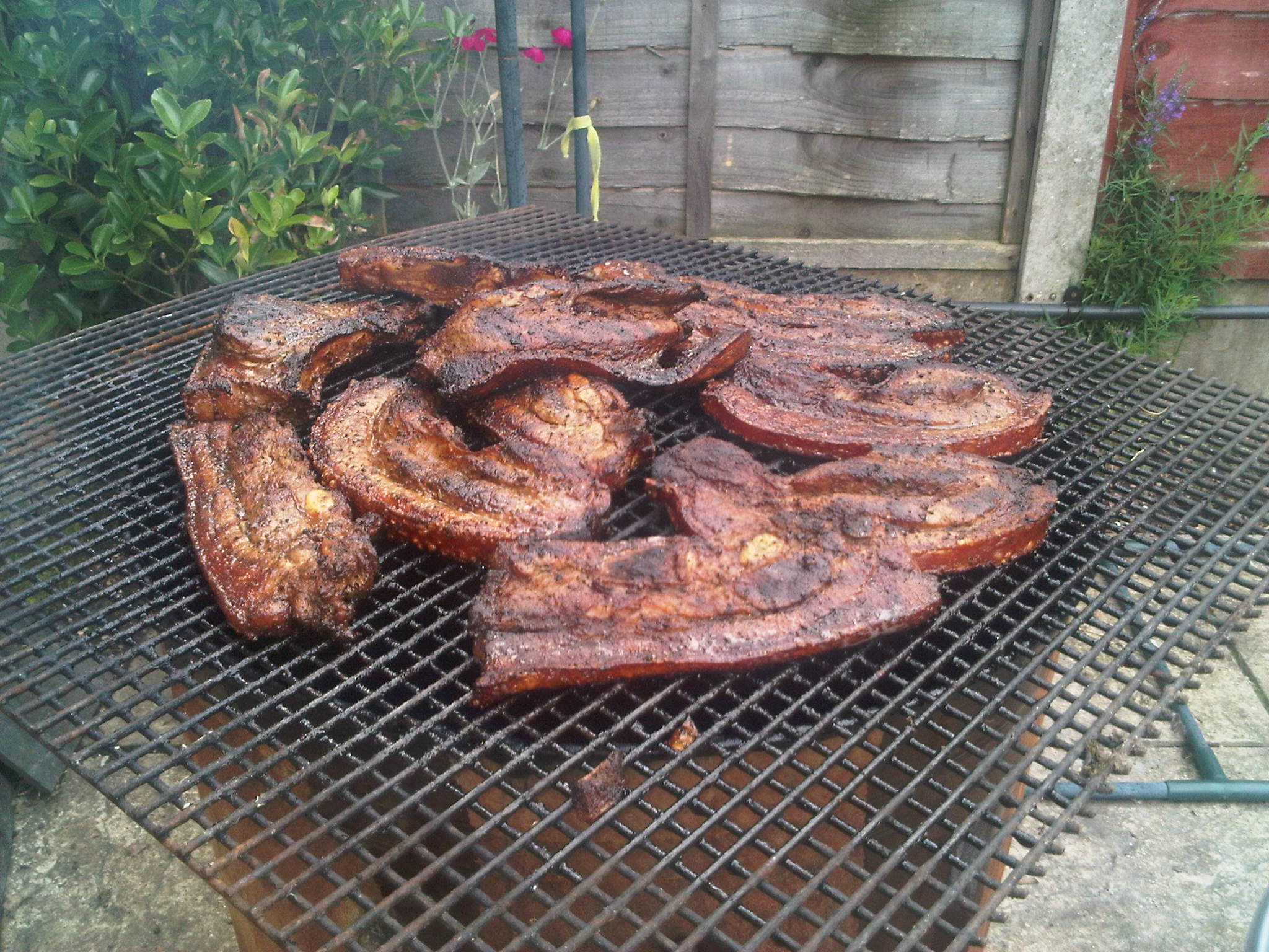 Prepare BBQ/Jerk Pan (you can use conventional oven).  When flame has died and only golden glow remains place belly draft/pork chops over hot coals. Cover BBQ/Jerk pan and slowly roast meat, taking care to turn regularly to prevent burning.  Cook thoroughly, until golden brown and all fat has rendered to leave crispy skin.  If using oven, place on oven rack.  Juices can be used to make a peppery Busta gravy (fiery, but delicious!).