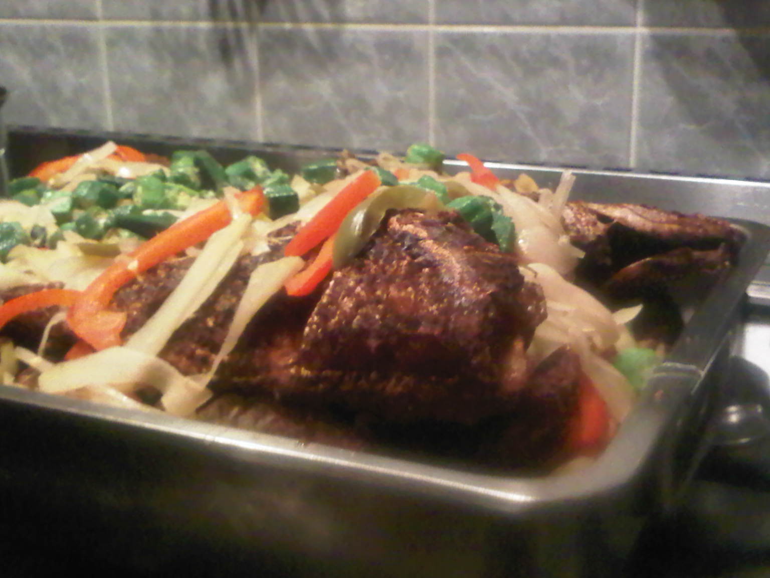 For the dressing, place all ingredients in saucepan with vinegar, apart from Okra.  Okra contains large amount of pectin and can become slimy, so best to stir-fry in a little olive oil with coarse black pepper and garlic.  Bring vinegar to boil and steam under gentle heat about 5mins, or until onions, fruit and other vegetables wilt.  Once ready pour dressing all over fried fish and once cooled cover with Ockra.